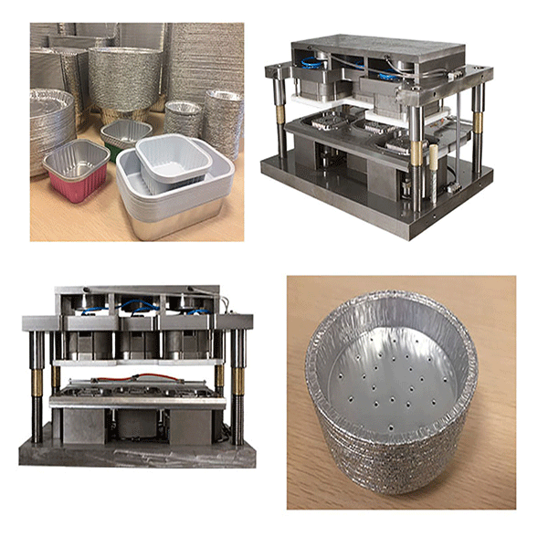 The mould adopts, pneumatic sprint device: die long life, stable quality, high precision, superior design. Aluminium foil container processing from material cut, forming, stretching, curling forming a container shape complete.